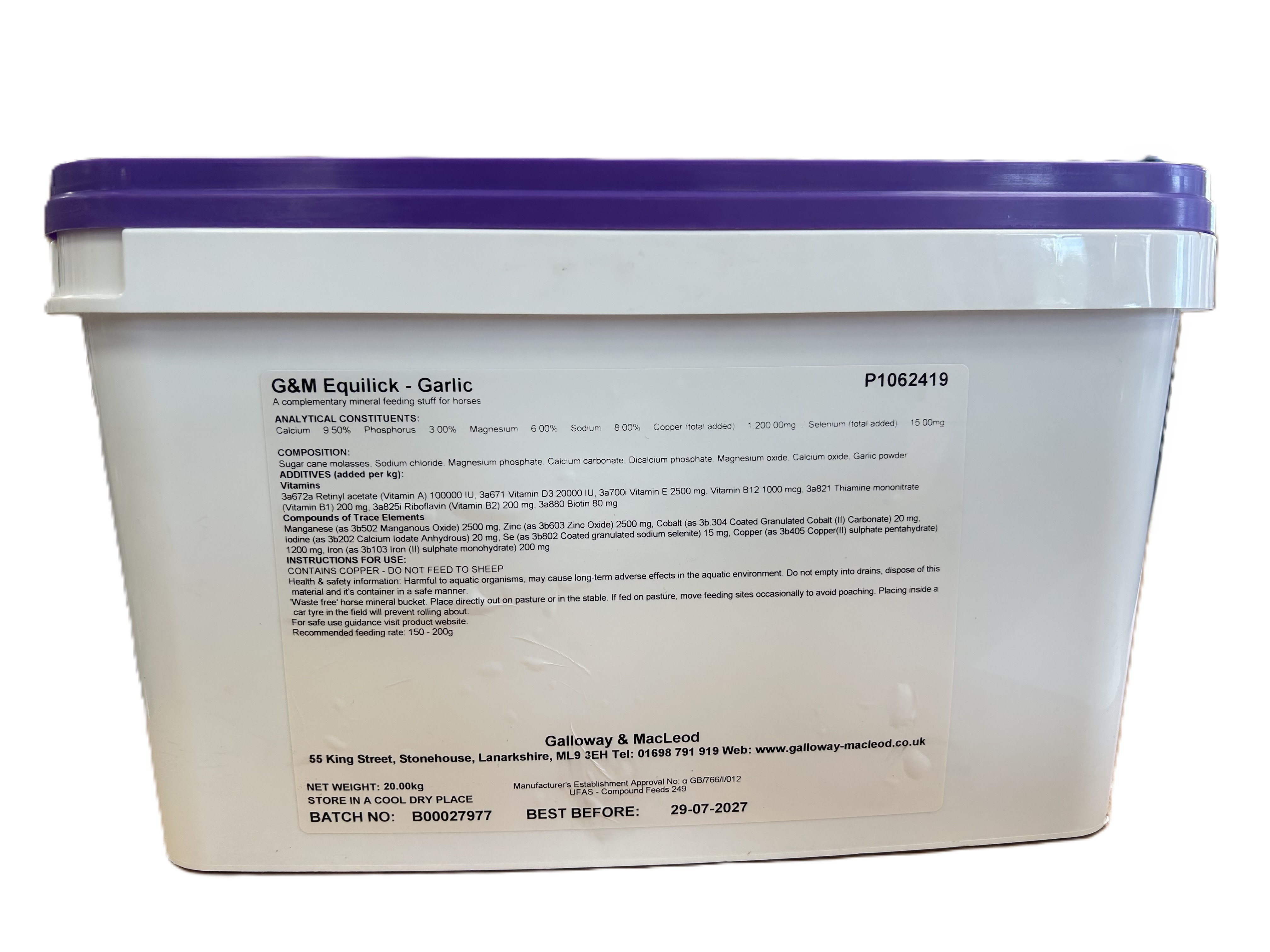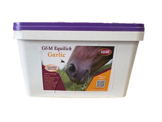 A complementary mineral feeding lick for horses with added garlic to prevent against insect bites.