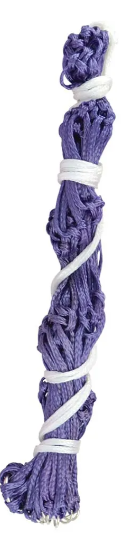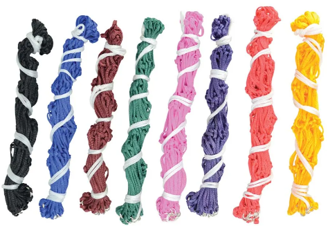 A large polypropylene mesh hay net with rings at the top and bottom.