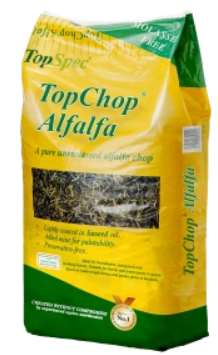 Natural product made from top quality British alfalfa, with a light dressing of soya oil and real mint. TopChop Alfalfa contains no added molasses or any other sugar coating. It is ideal for working horses, broodmares and youngstock.