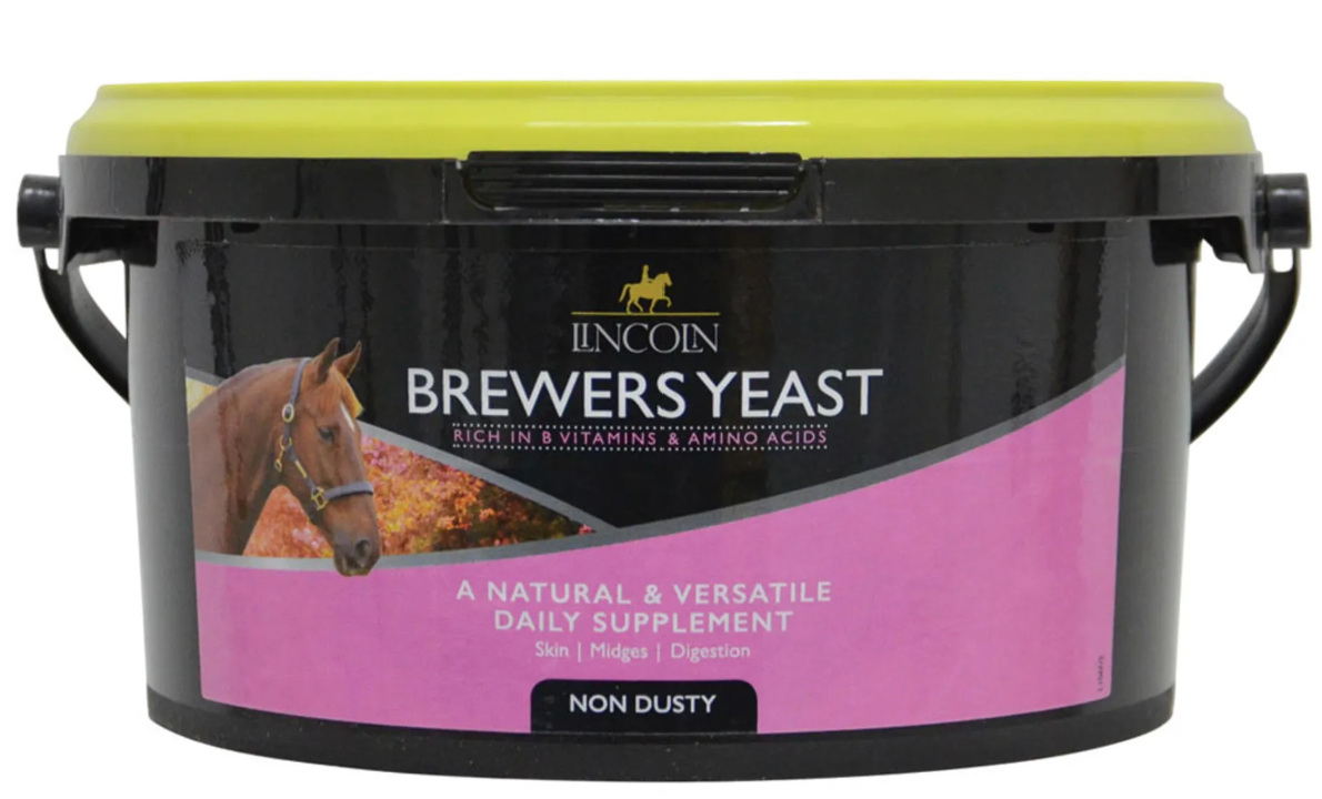 Lincoln Brewers Yeast is a natural, daily equine supplement which is rich in B Vitamins and Amino Acids, it is beneficial for stressed and anxious horses. It helps optimise energy conversion of feed, making it ideal for growing and convalescing horses. With the added bonus helping to deter midges too. Containing SACCHAROMYCES CEREVISAE this is a naturally occurring substance rich in B Vitamins and Amino Acids to support a healthy gut flora and many other benefits. A great supplement that provides valuable support for the nervous system, with levels of Vitamin BI (Thaimaine ) to help maintain calmness, containing Biotin, Methionine, Zinc and Copper to maintain healthy, strong hooves. This supplement has high levels of protein, Selenium and Chromium for overall health and immunity. Proven in the promotion of weight gain/conditioning and efficient digestion by aiding fibre digestion for optimal energy conversion. Also supporting healthy skin and ideal for poor doers.. A highly palatable and non-dusty grade.