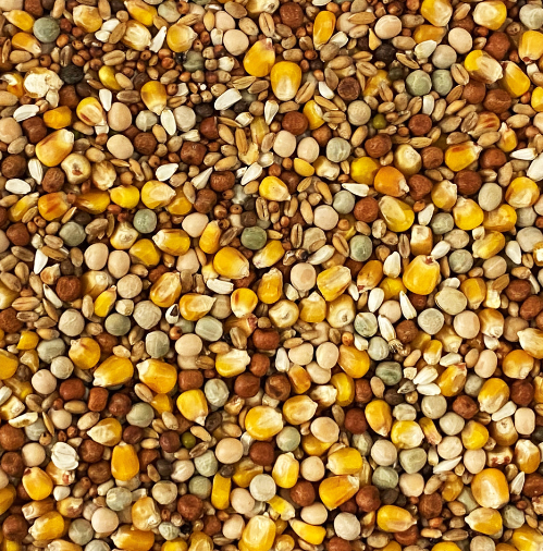 Whole maize, wheat, blue peas, maple peas, red darl, yellow peas, safflower seed, paddy rice, tares, mung beans