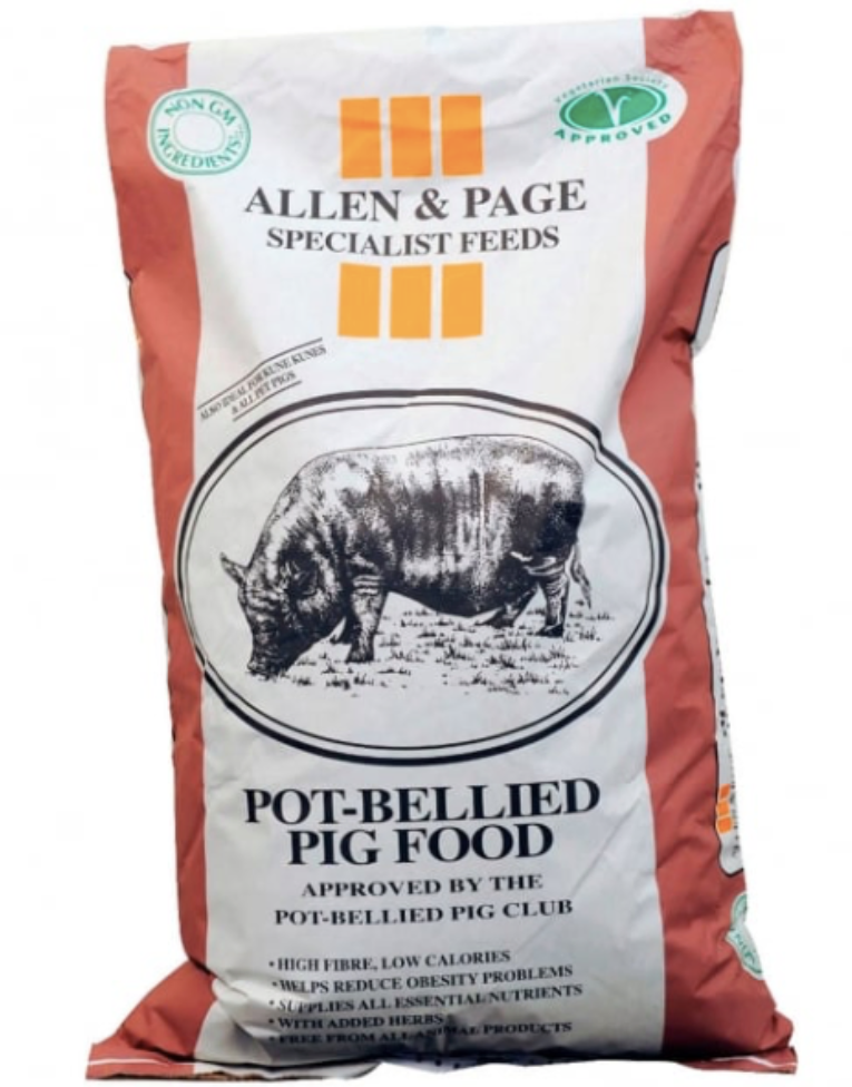 Allen & Page Pot Bellied Pig Food is specially formulated with higher fibre levels and lower levels of protein and energy to help avoid obesity and is suitable for Kune Kunes, Micro Pigs and all pet pigs. Part of the Allen & Page Small Holder Range, Allen & Page Pot Bellied Pig Food is ideally suited for pigs that are kept in free range, non-intensive production or as pets.