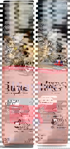 Burgess Adult Scottish Salmon is a complete dry food for adult cats. It contains fish oils to promote healthy skin and a glossy coat, Taurine and Vitamin A for bright eyes, and has no added colours. Antioxidant vitamins are present to help control the effects of ageing and help support the immune system. The kibbles have been coated with STAYClean which helps to reduce plaque and tartar on the cat's teeth. It has been specially formulated to be a supatasty meal each and every time.