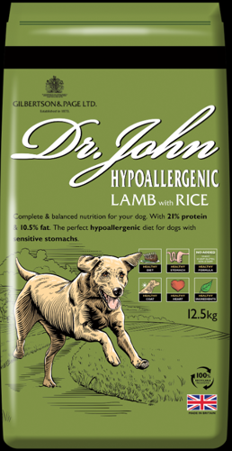 Dr. John Hypoallergenic Lamb with Rice is a hypoallergenic recipe made without wheat. Loaded with lamb (26%) providing healthy protein and essential fats and with a crunchy base of wholesome rice and barley, Dr. John Hypoallergenic Lamb with rice is designed to help support working dogs with sensitive stomachs or those with difficulty digesting wheat.