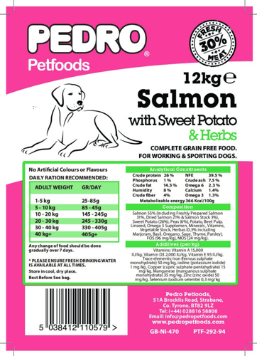 Salmon 55% (including Freshly Prepared Salmon 31%,Dried Salmon 21% & Salmon Stock 3%), SweetPotato(26%), Peas (6%),Potato,BeetPulp, Linseed, Omega3 Supplemen, Minerals, Vitamins, VegetableStock, Herbas(0,3% including Marjoram, Basil, Oregano, Sage, Thyme, Parsley), FOS (96 mg/kg), MOS (24 mg/kg)
