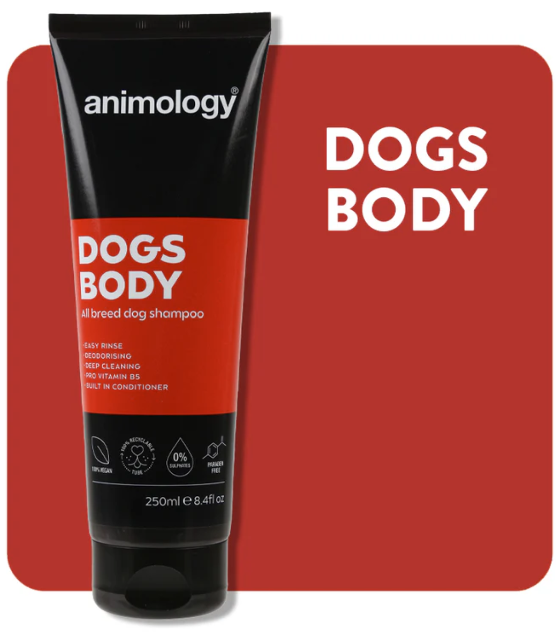 Dogs Body shampoo is an all-breed dog shampoo suitable for cleaning, deodorising and conditioning. With built in conditioner and pro-vitamin B5, Dogs Body helps to keep your dog’s coat beautifully clean and healthy. Dogs Body can be used on all coat and skin types including sensitive skin, and is suitable for all dogs from 6 weeks old. All Animology dog shampoos have a mild yet deep cleaning action that removes dirt and odour without stripping the coat of its essential oils. Our 'easy rinse' formulation keeps washing time to a minimum, while the built-in conditioner and Pro-Vitamin B5 help to improve the health, strength and condition of your dog's coat.