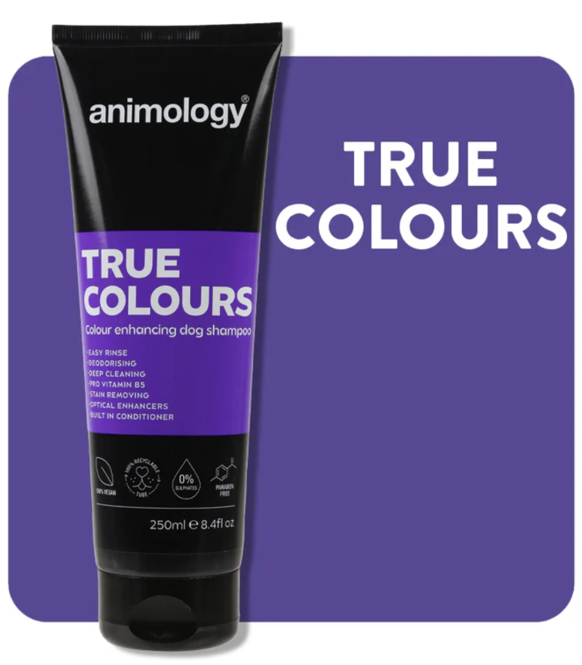 True Colours dog shampoo has been specially formulated to clean, deodorise, condition and enhance the colour of your dog's coat. With built in conditioner and pro-vitamin B5, it helps to keep your dog’s coat beautifully clean and healthy. True Colours also has a deep cleaning and stain removing formulation to help improve the colour and overall appearance of your dog's coat. True Colours can be used on all coat colours and skin types including sensitive skin. It is suitable for all dogs from 6 weeks old. All Animology dog shampoos have a mild yet deep cleaning action that removes dirt and odour without stripping the coat of its essential oils. Our 'easy rinse' formulation keeps washing time to a minimum, while the built-in conditioner and Pro-Vitamin B5 help to improve the health, strength and condition of your dog's coat.