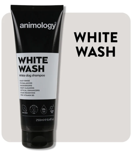 White Wash dog shampoo has been specially formulated for light and white coloured coats. It has a deep clean, stain removing formulation to help improve the colour and overall appearance of your dog's coat. With built in conditioner and pro-vitamin B5, it also helps to keep your dog’s coat beautifully clean and healthy. White Wash can be used on all coat and skin types including sensitive skin, and is suitable for all dogs from 6 weeks old. All Animology dog shampoos have a mild yet deep cleaning action that removes dirt and odour without stripping the coat of its essential oils. Our 'easy rinse' formulation keeps washing time to a minimum, while the built-in conditioner and Pro-Vitamin B5 help to improve the health, strength and condition of your dog's coat.