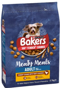 BAKERS Meaty Meals dry dog food consists of tender* chunks with tasty chicken *softness varying with time. 100% complete, this recipe is a complete nutritional balance for your Adult dog's daily needs, keeping your dog's tail wagging for more.