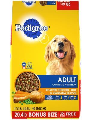 PEDIGREE® Adult Complete Nutrition Roasted Chicken, Rice & Vegetable Flavour Dry Dog Food is formulated to give dogs all of the energy and nourishment they need to continue living life to the fullest. This chicken-flavour dog food is packed with B vitamins, zinc and omega-6 fatty acid to help keep adult dogs looking their best. PEDIGREE® Dry Dog Food also contains leading levels of the antioxidant, vitamin E, to help keep adult dogs' immune systems strong. Plus, this balanced dog food features our special fibre blend, which helps promote healthy digestion, to keep yard patrol in control. Feed your dog this oral care kibble to help keep teeth clean and give them a great taste.
