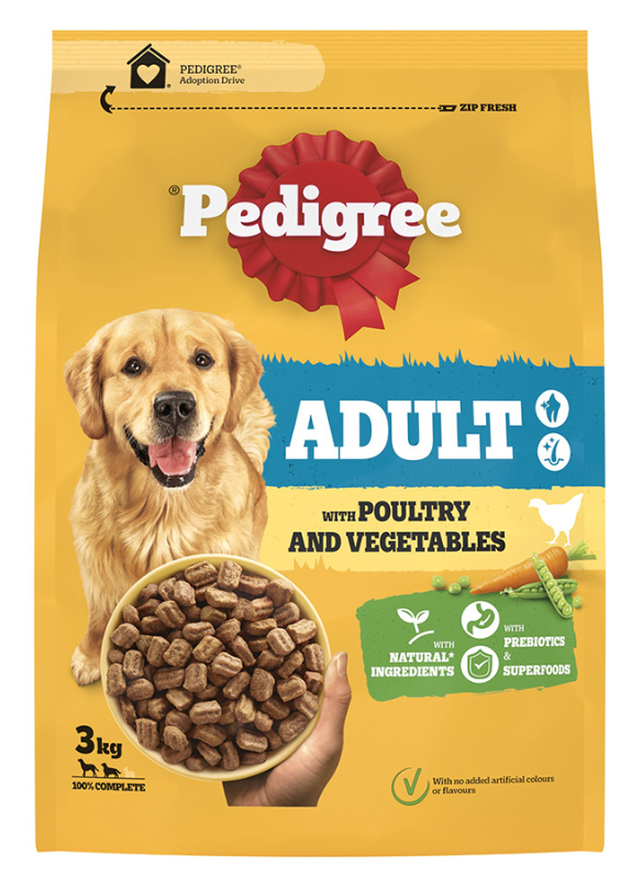 Pedigree Complete Adult Dry Dog Food Poultry and Vegetables 3kg dry dog food is 100% complete and balanced and made with selected natural ingredients, plus vitamins and minerals, delivering everything that is essential to fuel all dogs' exuberant love of life.