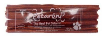 Made with 100% meat, Burns petaroni sticks have a smokey bacon flavour. Salami chew sticks are made with 100% meat - there are no biscuitor cereal ingredients. Burns Petaroni sticks are gluten free and have no artificial flavourings.
