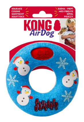 KONG Holiday AirDog Donut combines two favorites— a tennis ball and a squeaker—into one fabulous fetch toy to help pups ring in the holidays with tons of fetching fun. KONG Tennis non-abrasive material is softer on teeth than regular tennis ball felt. The squeaker calls dogs to play while the dynamic bounce makes for unpredictable rebounds, rolling and fetching fun with a dog-friendly holiday donut with a hole that makes grabbing easy.
