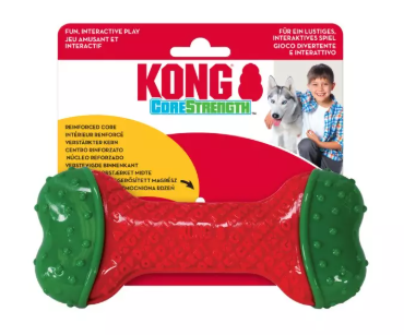 KONG Holiday CoreStrength Bone in bright holiday colors is built to deliver long-lasting chewing satisfaction with a durable KONG-crafted, multi-layered core. The exterior texture prolongs chewing and helps clean teeth and gums between all those holiday treats. Ideal for independent play and interactive fun through the holidays and beyond.