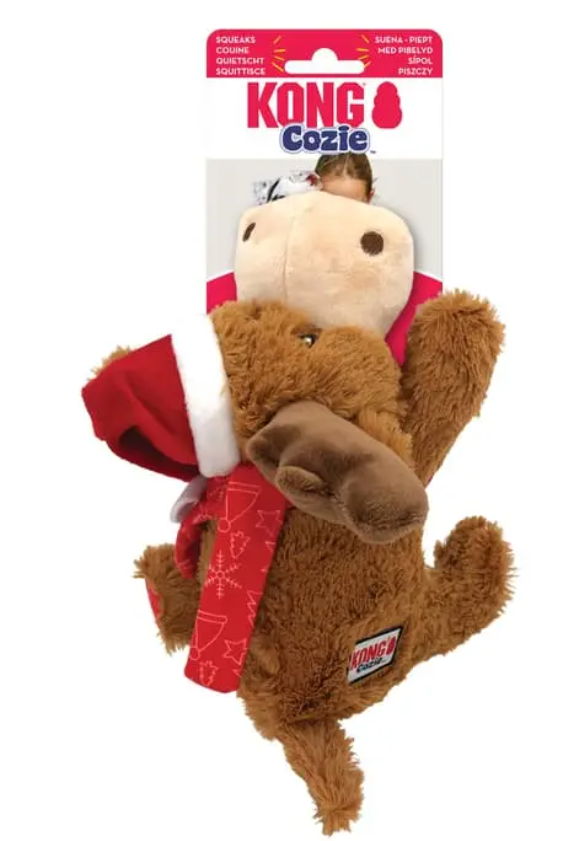 KONG Holiday Cozie Reindeer’s luxuriously soft plush makes him an idea snuggle buddy for dogs during the busy holiday season—complete with Santa hat and seasonal scarf to brighten festivities. The cuddly fur is reinforced with an extra layer of material so this adorable pal will still be around to play long after Rudolph and his crew have come and gone.