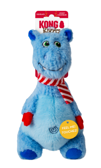 KONG® Holiday Knots Belly Hippo gives Santa’s bowl full of jelly competition! Soft and cuddly on the outside, a strong, durable rope ball on the inside makes its belly round and weighty. This dense internal skeleton rope ball adds heft and movement that entices instinctual thrashing, flinging, and light chewing. A squeaker in this hippo’s head piques dogs’ interest and adds excitement to play sessions. Knots Belly Hippo is also ideal for dogs who like to carry their toys, as well as for naptime snuggles. Dressed seasonally for the perfect holiday gift!