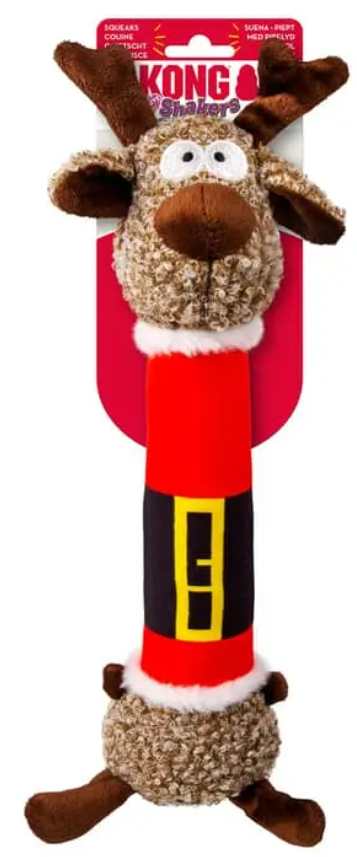 KONG® Holiday Shakers Luvz Reindeer’s long, floppy body satisfies dogs’ shaking instincts—and is also ideal for sliding down chimneys. Low-tone squeaker keeps dogs playing through the holidays and beyond, providing tons of healthy, active play with a pal dressed up for the holidays. This long, skinny reindeer’s the ideal shape for thrashing fun—and sliding down chimneys! Low-tone squeaker prolongs play, holiday sweater brightens the fun.