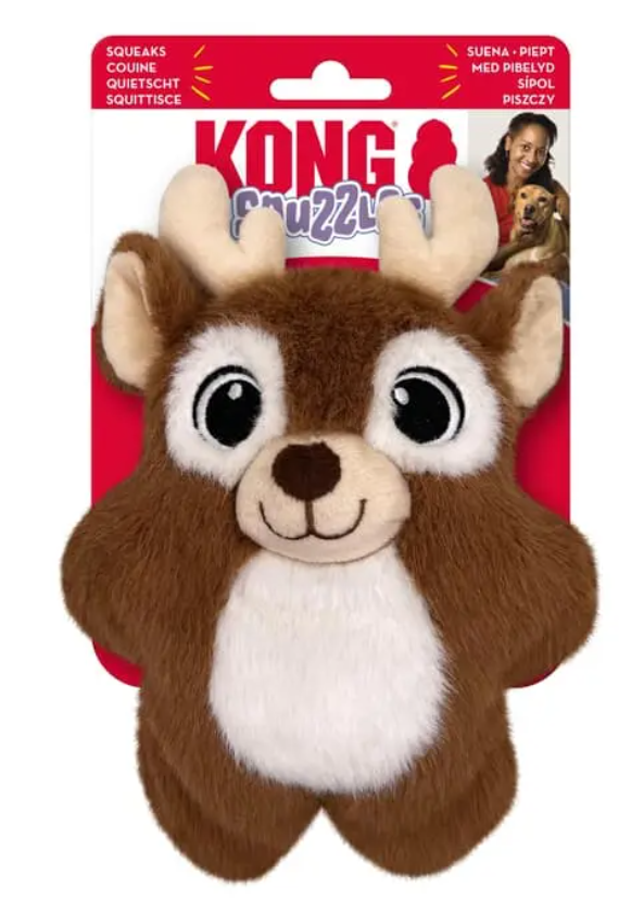 KONG Holiday Snuzzles Reindeer is plump-full of fun! Filled with a full-body squeaker that gives a long, loud call and a super-plush exterior that is perfect for holiday snuggles. The dense mouthfeel extends engagement by rewarding appropriate chewing with every bite. Ideal for indoor fun when the weather outside is frightful, the flat shape is ideal for dogs of all different sizes.