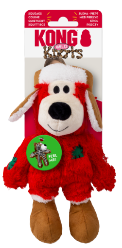 KONG® Holiday Wild Knots Bear is soft and snuggly on the outside and tough on the inside thanks to an internal knotted rope skeleton that helps him last way longer than the holidays. Seasonal colors and accessories are perfect for wintertime snuggles and indoor play. Chewing and tugging on this durable, adorable friend satisfies natural instincts while the squeaker prolongs play. Less stuffing makes for less mess if things get too wild!
